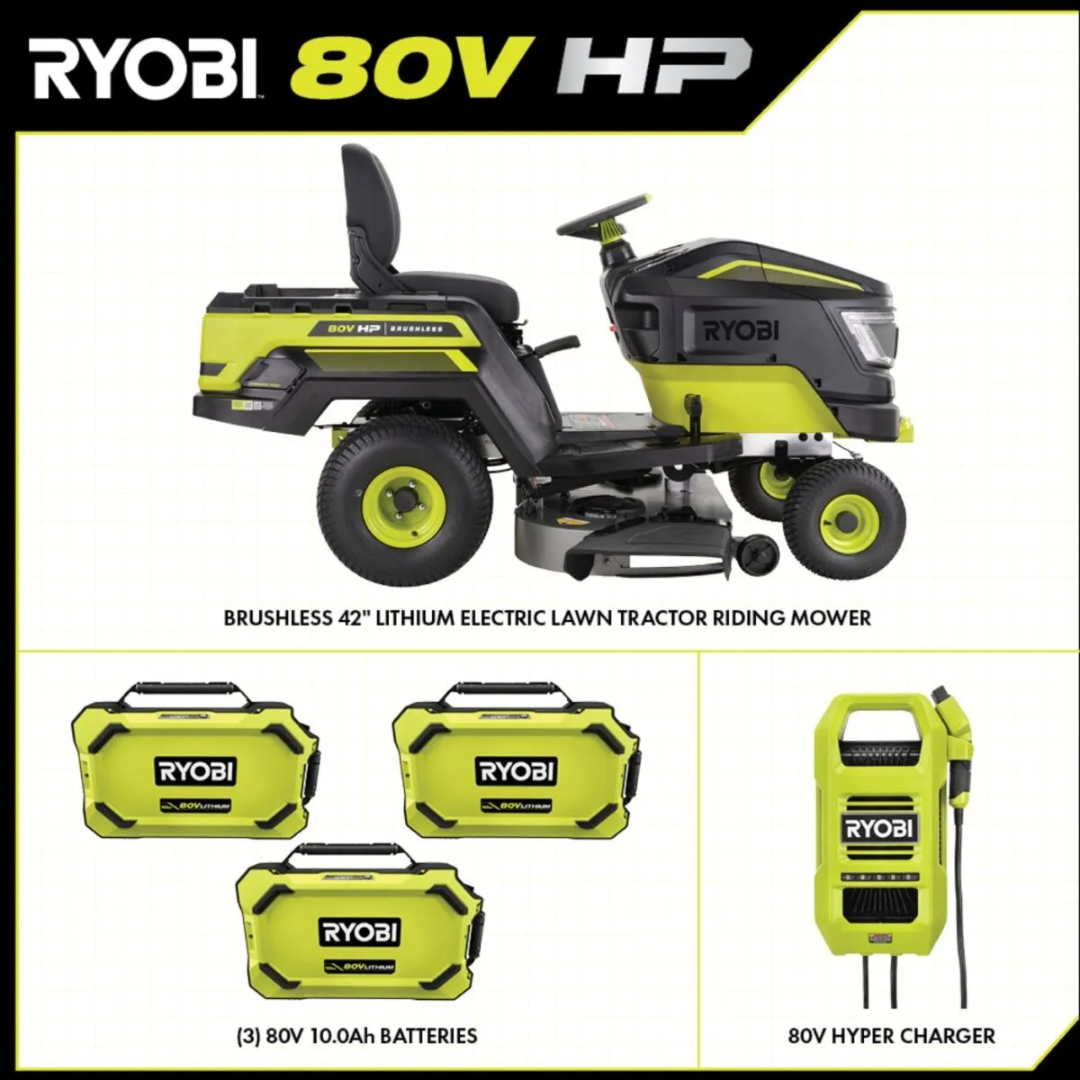 The Ryobi 80V HP Brushless 42‑Inch Battery Electric Riding Lawn Tractor is a powerful battery-powered lawn tractor designed to deliver gas-level performance while eliminating the noise, maintenance, and emissions associated with traditional gas mowers. Featuring advanced 80V HP lithium battery technology and multiple brushless motors, this riding mower provides the power equivalent of a 21-horsepower gas engine, making it suitable for large residential lawns and demanding mowing conditions.